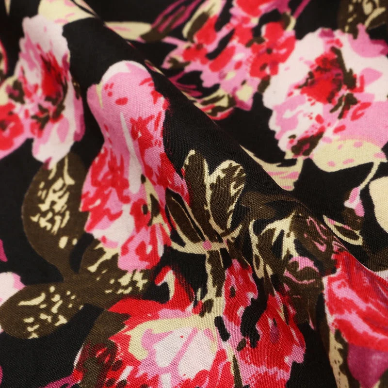 Black And Red Floral Pattern Screen Print Micro Crepe Fabric