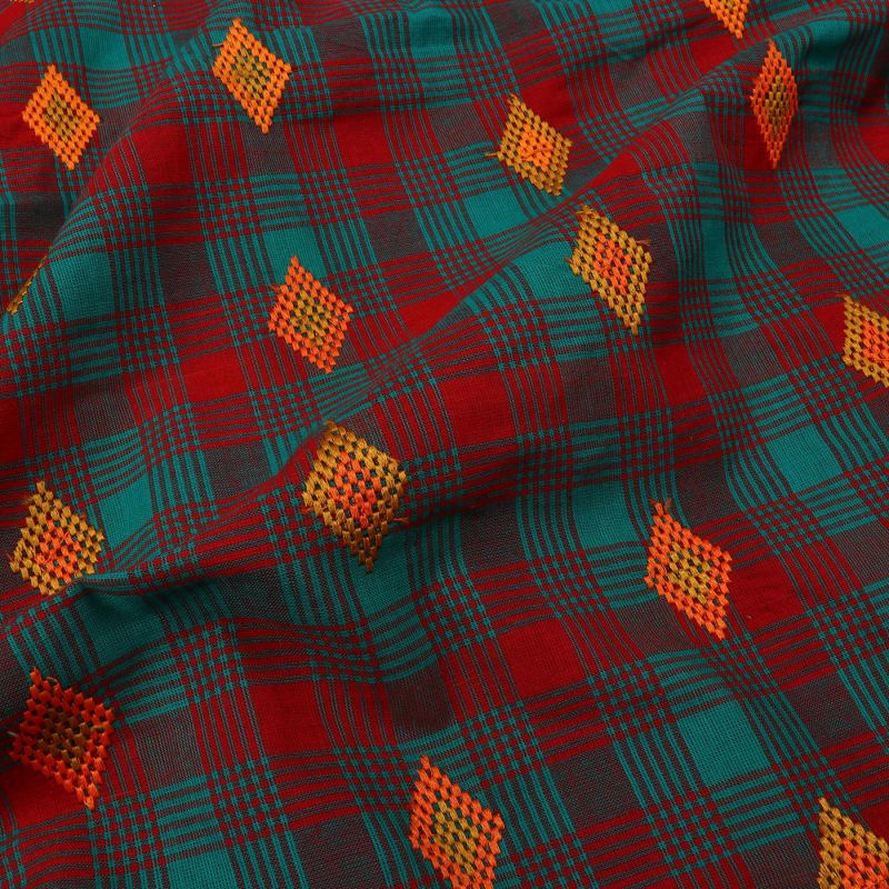 Dusty Green And Red Checks Pattern Dyed Embroidery Cotton Fabric